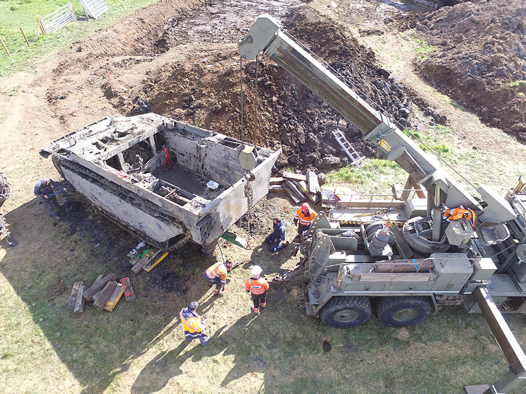 After hearing about the disappearance of the 26ft, 18,000 kg tanks, Daniel Abbott, Chairman of the Crowland Buffalo LVT Historical Group committed himself to finding the tanks over the last four years. Starting with a dedicated committee of friends to help him research, ongoing fundraisers to maintain necessary funds and help from RAF Wittering, along with an army of volunteers and a drone flight from Crowland Cranes, the first Buffalo craft was finally recovered after a five day operation ending on Thursday 29th April 2021.