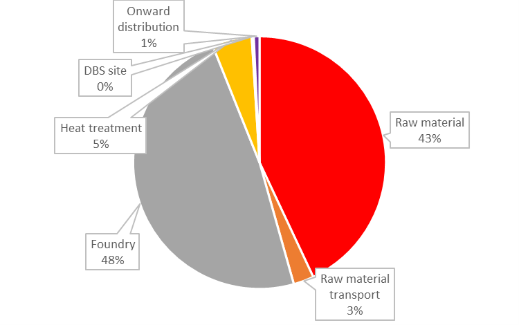 It was identified that the greatest proportion of emissions are associated with the foundry production processes due to the energy intensive nature of the industry. The second largest element of climate impact was the raw material supply. The transport element of both raw materials to manufacturing and that of the finished product to customer was limited. Emissions associated with DBS machining and assembly were also minimal, primarily as a result of the Jyväsklyä facility benefiting from hydro-electric power and district heating.